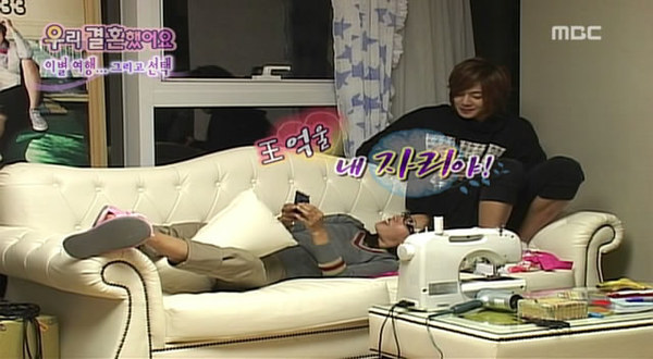 雖然是在玩遊戲,可是整個好溫馨,(完全無視小新郎被逼到沙發扶手上XD)